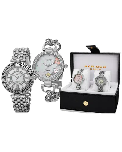 Box Set Of Two Women's Watches Akribos Xxiv Women's Diamond Watch: Quartz Movement Silver-Tone Base Metal Bracelet Fold-Over Clasp Silver-Tone Etched Bezel Silver-Tone Base Metal Case Sapphire-Coated Mineral Crystal Push-Pull Crown Mother-Of-Pearl Dial With Silver-Tone Hands Diamond Hour Markers Case: 36Mm In Diameter X 9Mm Thick Bracelet: 16Mm Wide X 7.5In Long Water-Resistant Up To 10 Meters Akribos Xxiv Women's Alloy Diamond Watch: Silver-Tone Alloy Bracelet Fold-Over Clasp Alloy Bezel Encrusted With Swarovski Crystals Alloy Case Sapphire-Coated Mineral Crystal Push-Pull Crown Diamond Accents On Dial Diamond Hour Markers Case: 36Mm In Diameter X 10Mm Thick Bracelet: 16Mm Wide X 7.5In Long Water-Resistant Up To 30 Meters 2-Year Limited Manufacturer's Limited Warranty Our Products Are 100% Genuine. In Some Cases We Purchase Merchandise From Trusted Independent Suppliers And Not Directly From The Brand Owner. In All Cases We Stand By The Authenticity Of Every Product Sold On Our Site.