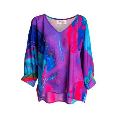 Enhance your wardrobe with our 3/4 Sleeve V Neck Blouse, showcasing vibrant artwork by Alana Kay. Perfect for any occasion, its comfortable fit and easy-to-wear design make a stylish statement. Keep it simple yet chic with this must-have addition to your closet! Dry Clean Only