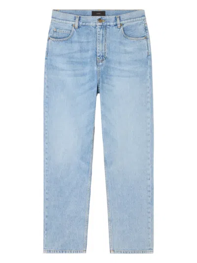 light wash blue patch pockets belt loops back pockets top button fastening five pocket style