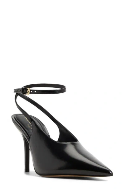 A pointy toe and high-cut topline create striking dimension on a lofty faux-leather pump set on a dual-density foam footbed and stiletto heel. 3 3/4" heel Adjustable ankle strap with buckle closure Cushioned footbed Synthetic upper and lining/rubber sole Imported