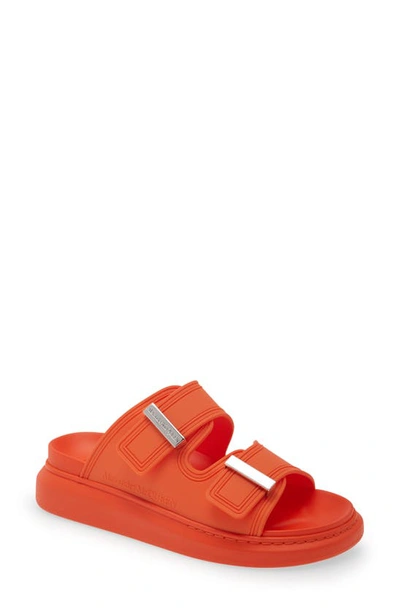 Alexander McQueen Fabric Upper and Rubber Slides in Acrylic Orange & Silver - Orange. Size 38 (also in 36.5, 37, 37.5, 38.5, 39.5). Rubber upper and sole. Made in Italy. Two buckle straps. Contoured footbed. 3D rubber logo on side. Round toe. Approx 45mm/ 1.75 inch platform. AMCQ-WZ126. 658063W4Q51. About the designer: Always the king of controversy, Alexander McQueen was known for runways exotic in clothing, models, and set decor. At a young age, McQueen cut his teeth on Savile Row, where he apprenticed with tailors Anderson & Sheppard and worked for Gieves & Hawkes. He later worked with Koji Tatsuno and Italy's Romeo Gigli before returning to London in 1994 to receive his masters from Central Saint Martins. Style icon Isabella Blow bought McQueen's entire graduation collection, marking the launch of his fashion career. McQueen received several awards and accolades, including the British Designer of the Year, which he won four times, the CBE, and was named International Designer of the Year by the CFDA in 2003. In addition to designing his own line, McQueen also served as head designer for Givenchy and collaborated with PUMA and MAC Cosmetics. McQueen's mainline features eccentric prints, avid use of color, innovative garment structure, and fan list that includes Daphne Guinness, Lady Gaga, and Bjork.