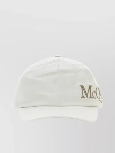 embroidered-logo baseball cap from Alexander McQueen featuring beige, cotton, eyelet detailing, embroidered logo to the side, curved peak and adjustable sliding fastening.