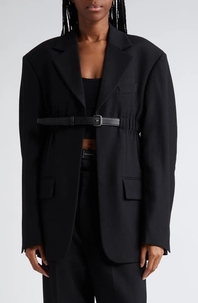 Black tailored blazer in wool with notch lapel collar, single welt pocket, and thin leather belt integrated into waist. Oversized fit. Hits at upper thigh. Front hook closure. Flap side pockets. Hidden buttons at sleeve cuff. Body composition: 100% wool. Lining composition: 100% viscose. Belt composition: 100% cow leather. Made in china. Model is 5'9" and wears size 2. 1WC1242513001.