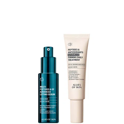 Discover Allies of Skin's longevity supporting skincare with the brand's flagship lifting and firming heroes - the bestselling growth factor infused Advanced Lifting Serum, and the Peptides & Antioxidants Advanced Firming Daily Treatment moisturiser. Proven to visibly reduce fine lines, increase skin smoothness, reduce sagging and improve skin quality. Clinically proven Multi Peptides & GF Advanced Lifting Serum is Allies of Skin's most potent solution to visibly reduce the 9 most stubborn wrinkles and fine lines: Forehead lines, frown lines, crow's feet, tear troughs, bunny lines, marionette lines, nasolabial folds, mental crease lines, and neck wrinkles. Supercharged with a maxed-out 3% Growth Factor Complex and 9% Lifting Peptide Complex, alongside MSM, Copper Lysinate, Phospholipids and Glycolipids. Dermatologically tested for sensitive skin. Allies of Skin's Peptides & Antioxidants Advanced Firming Daily Treatment, as concentrated as a mask, delivered in the form of a daily moisturizer. Supercharged with 13 Brighteners, 9 Antioxidants, 7 Firming Peptides, a 5% Teprenone & Ferulic Complex and a 3% Biotech Algae Complex that work together to in 5 ways to hydrate, firm, refine, provide antioxidant protection, and brighten skin as well as revive lost firmness to your complexion. Dermatologically tested.* Clinically proven results for all skin types, including sensitive skin.