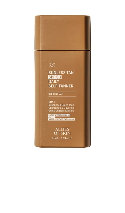 Allies of Skin Sunless Tan SPF 50 Daily Self-Tanner in Beauty: NA. Allies of Skin Sunless Tan SPF 50 Daily Self-Tanner in Beauty: NA. Discover the Allies of Skin breakthrough 3-in-1 sunscreen that leaves you more sun-kissed by the hour. Supercharged with DHA, Vitamin C, and Goji Berry Extract, alongside Centella Asiatica, Green Tea Leaf, Liquorice Root, and Chamomile Flower Extract. Broad-Spectrum SPF 50, PA++++ protection helps shield skin from UV-induced skin damage and premature aging, while a buildable, gradual and natural-looking healthy glow and tan appears throughout the day.. Vegan and cruelty-free Free of silicones, sulfates, and essential oils. Dihydroxyacetone is a naturally occurring 3-carbon sugar, known to gradually and temporarily give the skin a natural-looking tan. Goji Berry Extract provides the necessary building blocks for collagen production in the skin, leading to a reduction of fine lines and wrinkles. 50ml. The last step of your AM routine or 15 minutes before sun exposure, apply minimum a teaspoon to face and neck. Tanning develops within 3 - 6 hours.. ASKI-WU48. PSDST050US01. Allies of Skin products are designed with a busy lifestyle in mind to be simple to use while maximizing the functions of smart formulations that support your skin's health. All of their ingredients are thoroughly researched, and they combine only effective, clinically-proven actives into clean formulas. The goal is to help your skin repair, regenerate, and reset itself so it can perform at its best. That's why they never include fillers or potential irritants that may compromise the skin's optimal functioning capabilities.