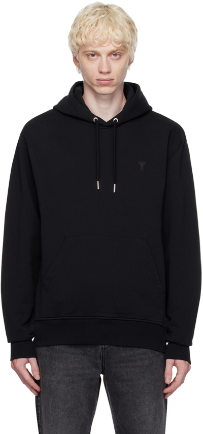 Black, long-sleeved hooded sweater with Ami de Coeur relief on chest, AMI embroidery on the back, metal ends of the same color and ami carved holes.