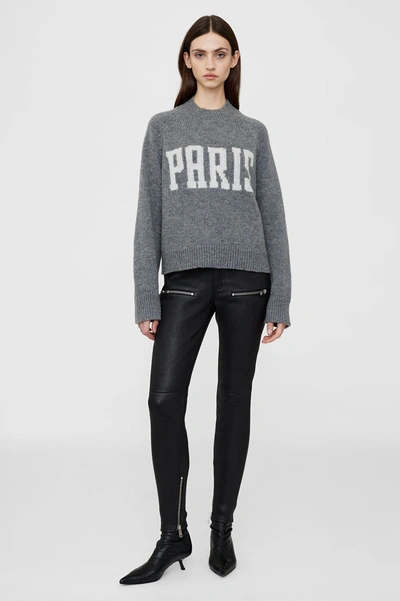 ANINE BING Kendrick Sweater University Paris in Charcoal. Size L, M, S. 82% extrafine merino wool 18% cashmere. Made in Turkey. Dry clean only. Ribbed neckline, cuffs and hem. Fuzzy knit fabric. ANIN-WK162. A-09-0270-013. Inspired by Scandinavian simplicity and vintage Americana, Los Angeles based fashion house Anine Bing has created a global brand for the modern woman seeking a timeless yet rebellious approach to style. From luxurious staples to wardrobe basics, Anine Bing provides the highest quality fabrications and materials in each collection that effortlessly fuse together edgy feminine designs.