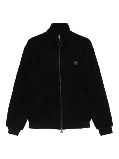 black front zip fastening appliqué logo stand-up collar long sleeves ribbed hem