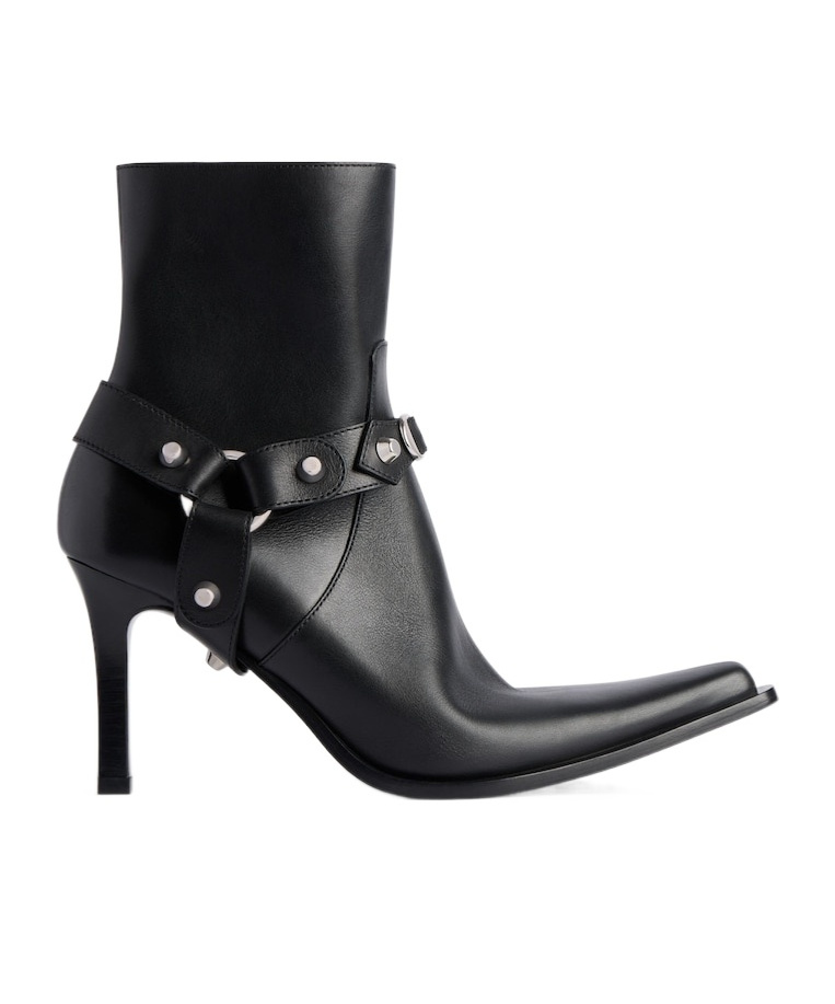 City 90mm Bootie With Harness in black soft calfskin Soft calfskin Bootie Pointed toe 90mm arch Hollowed out design at front Inner zipped closure with knotted leather puller Removable harness with studs Black sole Made in Italy * Upper: calfskin - Sole: calfskin - Insole: calfskin