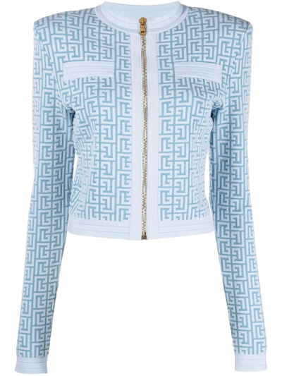 BALMAIN Blue Monogram-pattern Cropped Jacket