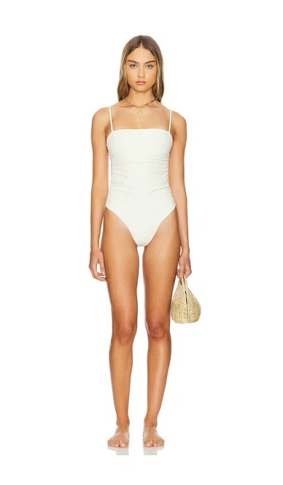 Belle The Label Ruched Maillot in Cream. - size S (also in L, M, XL, XS) Belle The Label Ruched Maillot in Cream. - size S (also in L, M, XL, XS) 80% nylon 20% spandex. Made in Bali. Machine wash. Unpadded cups. Adjustable shoulder straps. Ruched sides. BLLE-WX70. HS2445.