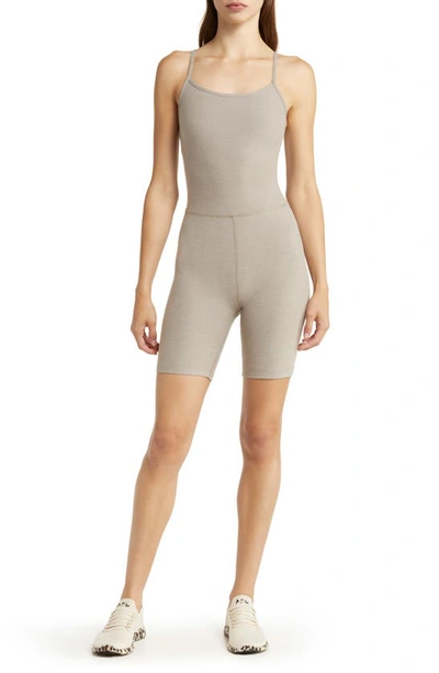 Beyond Yoga Spacedye Get In Gear Biker Jumpsuit in Birch Heather - Taupe. Size L (also in XS, S, M). 87% polyester 13% elastane. Made in USA. Machine wash. Built-in shelf bra. Adjustable shoulder straps. BEYF-WR3. SD6188. About the designer: A leader in buttery soft athleisure wear, Beyond Yoga accompanies the modern woman everywhere life takes her, from barre class to casual days. Founded on the idea that authenticity and ease are key to confidence, Beyond Yoga celebrates all body types with inclusive designs and sizes that fit as comfortably as a second skin. With fine fabrics and flattering cuts, slipping into Beyond Yoga is a sheer act of luxury. Ultimately, the Los Angeles-based brand seeks to inspire women to feel beautiful inside and out: because when we feel good, we go beyond the ordinary.