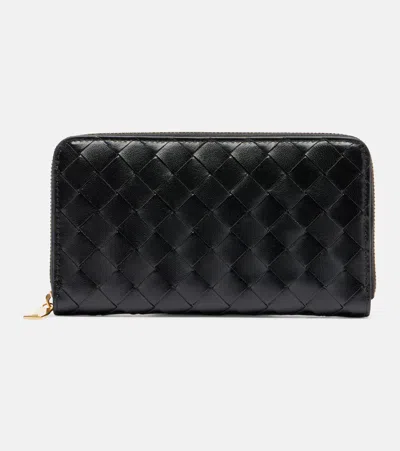 Intrecciato leather wallet. Eight card slots, two bill compartments, two additional pockets, one zippered coin purse. Zipper closure. Lining: Calfskin. Color: Black. Hardware: Gold finish. Height: 10 cm. Width: 19 cm. Depth: 2 cm. 100% Lambskin.