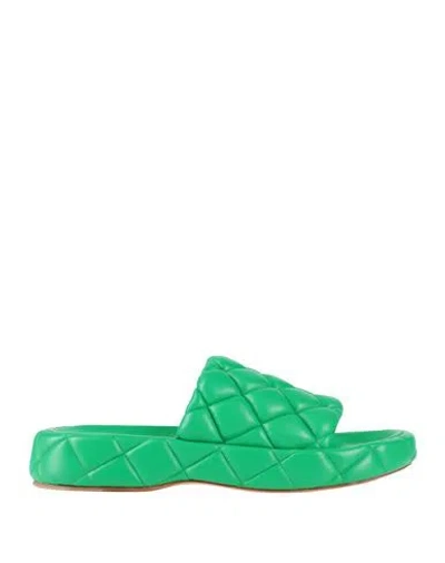 leather, quilted, no appliqués, solid color, leather lining, round toe, flat, leather sole, contains non-textile parts of animal origin, slide sandals , Color: Green , Size: 9