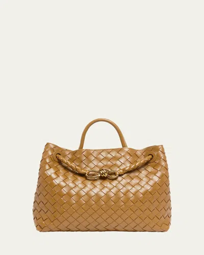 Bottega Veneta "Andiamo" top handle bag in intreccio lambskin leather Rolled top handle, 3.5" drop Shoulder strap Can be worn as a top handle or shoulder bag Open top with magnetic closure; metal knot center strap Approx. 9.8"H x 11.6"W x 4.3"D Made in Italy