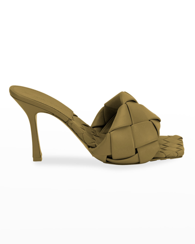 Bottega Veneta woven leather mule sandals. 3.5" covered heel. Elongated square open toe. Single-band vamp. Slide style. Leather lining and sole. Made in Italy.