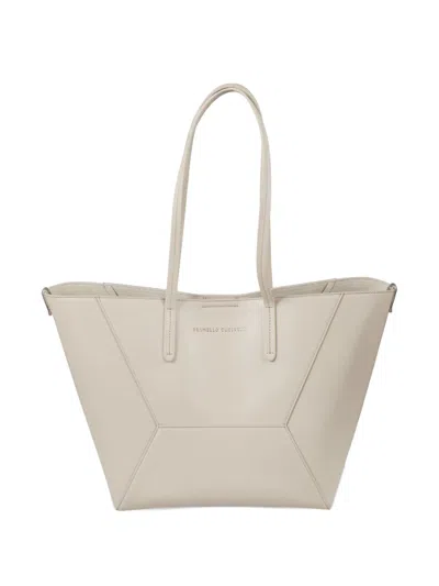 Brunello Cucinelli large "BC Duo" shoulder bag crafted from calfskin leather with a smooth and homogeneous texture, worked with a matte finish. The silhouette features squared lines and solid structure, with exposed stitching emphasizing the minimal profile. The double handle offers shoulder portability, while the internal drawstrings allow you to adjust the shape of the bag, making it more compact. The zippered top closure provides security and functionality. || - Calfskin leather - Top zipper closure - Double handles - Removable interior zippered pouch - Interior side ties to adjust the structure - Nickel-free monile embroidery - Structure with exposed stitching Brunello Cucinelli "BC Duo" large shoulder bag 100% calf leather 44x26x19 cm