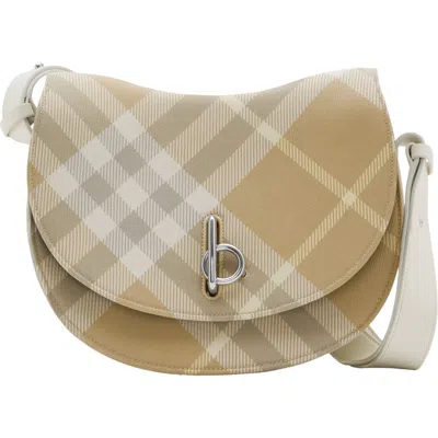 A structured bag made in Italy from a wool blend jacquard-woven with the Burberry Check and lined in contrasting vine green smooth leather. The saddle style has a curved shape and arched profile with prongs at the strap inspired by hardware found on equestrian reins. Our signature ‘b’ closure pivots in place to secure the flap and the adjustable strap switches the design from a shoulder to a crossbody bag.||Burberry Check wool blend|Adjustable leather strap |Foldover flap with ‘b’ closure |Two interior slip pockets, exterior slip pocket with magnetic closure |Hand-painted edges |Brushed metal hardware |Leather lining |Comes with a dust bag 26 x 9.5 x 20.5cm/10.2 x 3.7 x 8.1in Min. strap drop: 26.5cm/10.4in Max. strap drop: 54cm/21.3in Outer: 66% polyester, 32% wool, 2% acrylic Trim: 100% calf leather Lining: 100% lambskin Made in Italy