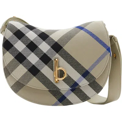 A structured bag made in Italy from a wool blend jacquard-woven with the Burberry Check and lined in contrasting vine green smooth leather. The saddle style has a curved shape and arched profile with prongs at the strap inspired by hardware found on equestrian reins. Our signature ‘b’ closure pivots in place to secure the flap and the adjustable strap switches the design from a shoulder to a crossbody bag.||Burberry Check wool blend|Adjustable leather strap |Foldover flap with ‘b’ closure |Two interior slip pockets, exterior slip pocket with magnetic closure |Hand-painted edges |Brushed metal hardware |Leather lining |Comes with a dust bag 26 x 9.5 x 20.5cm/10.2 x 3.7 x 8.1in Min. strap drop: 26.5cm/10.4in Max. strap drop: 54cm/21.3in Outer: 66% polyester, 32% wool, 2% acrylic Trim: 100% calf leather Lining: 100% lambskin Made in Italy