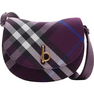 A structured bag made in Italy from a wool blend jacquard-woven with the Burberry Check and lined in contrasting vine green smooth leather. The saddle style has a curved shape and arched profile with prongs at the strap inspired by hardware found on equestrian reins. Our signature ‘b’ closure pivots in place to secure the flap and the adjustable strap switches the design from a shoulder to a crossbody bag.||Burberry Check wool blend|Adjustable leather strap |Foldover flap with ‘b’ closure |Two interior slip pockets, exterior slip pocket with magnetic closure |Hand-painted edges |Brushed metal hardware |Leather lining |Comes with a dust bag 26 x 9.5 x 20.5cm/10.2 x 3.7 x 8.1in Min. strap drop: 26.5cm/10.4in Max. strap drop: 54cm/21.3in Outer: 66% polyester, 32% wool, 2% acrylic Trim: 100% calf leather Lining: 100% lambskin Made in Italy