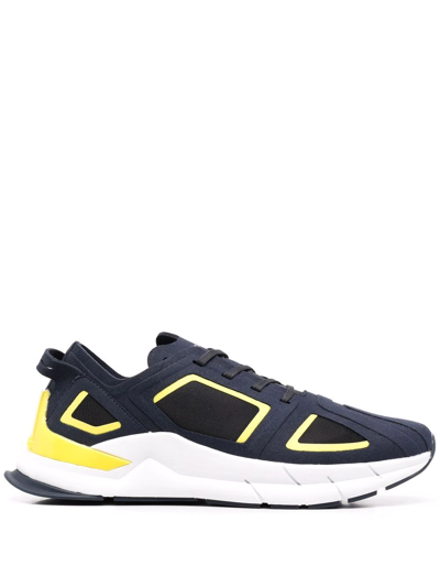 Navy blue/yellow/white colour-block low-top sneakers from CALVIN KLEIN featuring colour-block design, logo-print tongue, round toe, front lace-up fastening, pull-tab at the heel and branded insole.