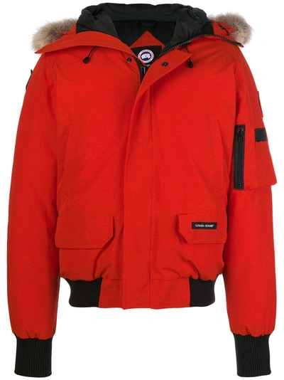Bright red feather down short parka from Canada Goose featuring a fur trimmed hood, side zipped pockets, a ribbed hem and cuffs, a front zip fastening, zipped patch pocket at the sleeve and a padded interior.