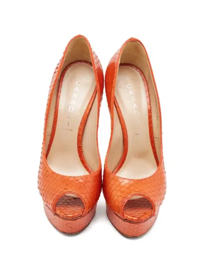 orange python leather peep toe platform sole stiletto heel durable sole Condition: GOOD. This previously owned and used item is in good condition with minimal signs of use. This may include fading of material or plating and scratches.