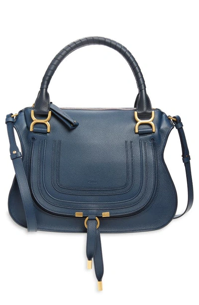 The Chloé Marcie double carry bag is crafted from grained leather and features a rolled leather handle and a slender adjustable, detachable shoulder strap. It has a zipper closure and a single compartment with a zippered interior pocket. The bag is finished with an embossed logo and gold finishes.
