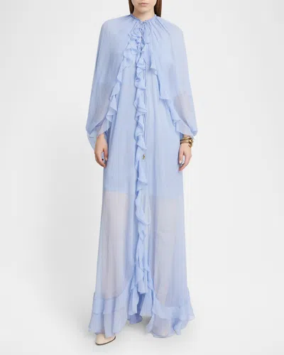 CHLOÉ Robe Cape Longue Volantée En Mousseline De Soie Femme Bleu Taille 38 100% Soie In Blue