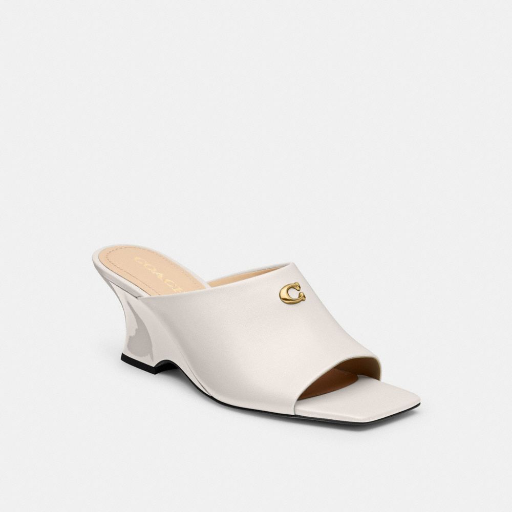 A sleek slip-on design our Celeste is crafted of smooth leather detailed with our polished Signature hardware. The square-toe sandal features a sculpted wedge heel and a padded footbed for day-to-night comfort. Coach Celeste Wedge - Women's Size 5.5 - Chalk