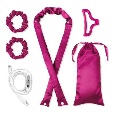 SATIN HEAT/HEATLESS CURLER. Benefits: Less damage: Crafted of plush, smooth satin to ensure minimum damage and maximum comfort. Easy to clean: Curling ribbon features a machine-washable satin sleeve. Features: 2-in-1 convenience: Use heat for dry hair or go heatless for damp hair. Style and set. Reveal beautiful curls. PRO TIP: For fast results, use the heated option on dry hair during the day. Use the heatless option on damp hair overnight. Includes: Fast heat-up: Includes USB cord to quickly heat up the curling ribbon. Convenient storage pouch: Keeps the set neatly stored in one place.