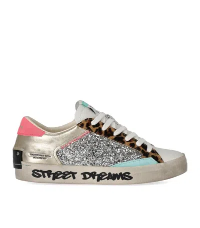 Distressed sneaker by Crime London made of platinum laminated leather embellished with silver sequins and animal print leather patchwork. Finished with aquamarine suede details, it features a white leather tongue with a fabric logo label. Logoed coral suede heel tab and black leather patch on the back. It has white cotton laces, leather lining, cotton sponge, and logoed leather insole. Ivory faux leather foxing sole adorned with "Sweet Dreams" lettering. Coral rubber sole. Height 3 cm.