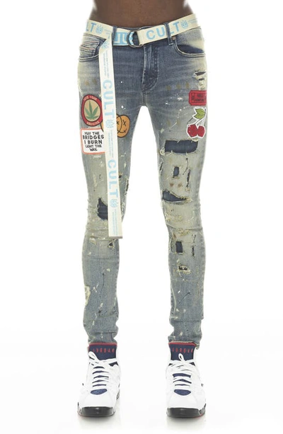 CULT OF INDIVIDUALITY Punk Belted Distressed Super Skinny Jeans In Blue