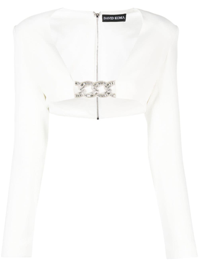 optical white glass crystal embellishment cut-out detailing plunging square neck rear zip fastening long sleeves straight hem cropped. Colour. : White. Composition. : Lining Composition Polyester: 97.0%, Outer Composition Acetate: 52.0%, Outer Composition Viscose: 45.0%, Outer Composition Glass: 100.0%, Outer Composition Elastane: 3.0%, Lining Composition Elastane: 3.0%. Country Of Manufacture. : United Kingdom. MPN. : PF23DK11TWHSIL. Size Family. : UK. .