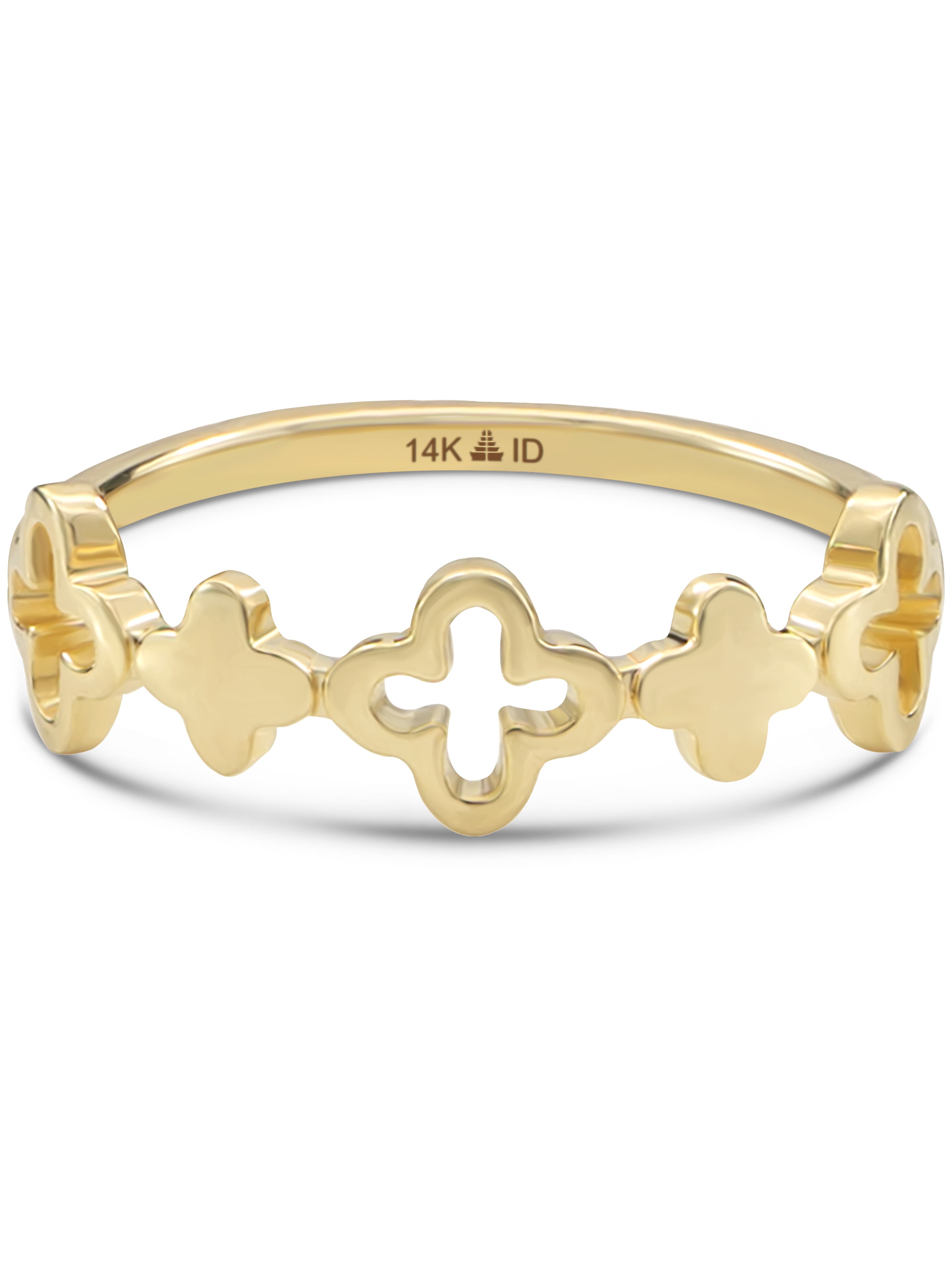Clover collection celebrates charm, good fortune, hope and prosperity. Featuring delicate four-leaf clover design, perfect for everyday wear or as a meaningful gift, this collection blends timeless elegance with a touch of grace. Crafted in 14K gold, stamped 14K to certify solid 14K Gold. Band ring width 6mm. Approx. weight 2.3 - 2.7 grams