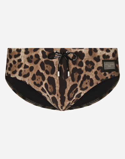 leopard-print swim briefs from DOLCE & GABBANA featuring brown, all-over leopard print, logo plaque, elasticated drawstring waistband and finished edge. Be mindful to try on swimwear over your own garments..