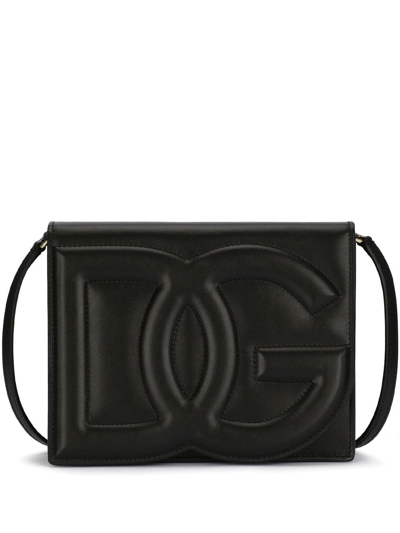 DG logo crossbody bag from DOLCE & GABBANA featuring black, calf leather, embossed logo to the front, adjustable shoulder strap, foldover top with magnetic fastening, gold-tone hardware, main compartment and internal zip pocket.