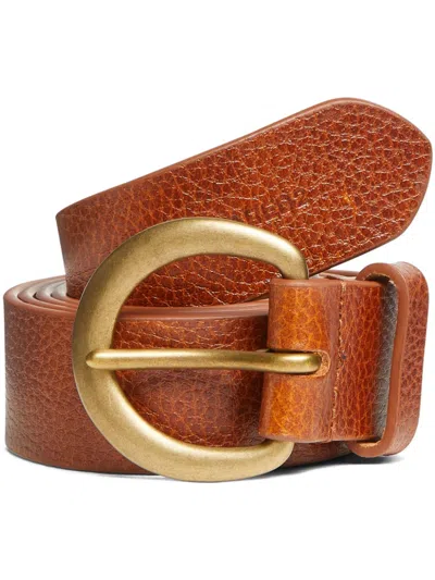 brown leather grained texture debossed logo to the front internal logo stamp buckle fastening punched holes adjustable fit