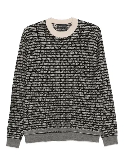 This Black EMPORIO ARMANI sweater features a bold all-over logo motif. Crafted from soft knitwear, it provides exceptional comfort and is perfect for sophisticated yet contemporary looks. Composition: Virgin Wool, 100%