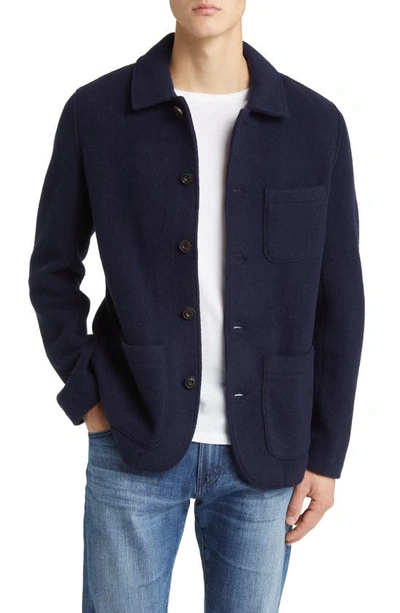 This classic style, favored by French workers and craftsmen since the 1800s, gets a cold weather update in our cozy, just warm-enough Italian wool knit fabric. With straightforward, utilitarian detailing and a made-to-layer fit make this rugged but elevated jacket the perfect piece for transitional temps. Fit: Relaxed, easy fit designed with room to layer a heavy shirt or sweater underneath. Detail: Three exterior patch pockets. One interior patch pockets. Button cuffs. Locker loop at interior collar for easy hanging. Material: 67% Wool, 30% Polyamide, 3% Other; Buffalo Horn Buttons with Logo Rim Model: Jamal is 6'2 wearing size Medium Care: Dry Clean. Do not Bleach. MOF2355-NVY Faherty Men's Wool Chore Jacket - Navy, Size 2XL, Fabric/Polyamide/Wool