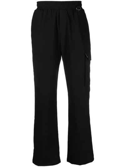 Black wool blend trousers, ring embellishment, stretch-design, elasticated waistband, side flap pocket, rear flap pocket, straight leg, slip-on style Composition: Polyester, 48% , Viscose, 30% , Wool, 10% , Elastane, 2%