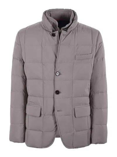 Blush beige feather down jacket, padded design, quilted, high neck, notched lapels, front button fastening, concealed front zip fastening, chest welt pocket, two front flap pockets, long sleeves, straight hem Composition: Outer: Polyester, 100% Lining: Polyamide, 100% , Feather Down, 100%