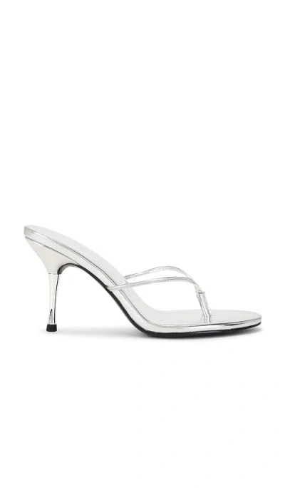 FEMME LA Osaka Sandal in Metallic Silver. - size 8 (also in 10, 5, 6, 7, 9) FEMME LA Osaka Sandal in Metallic Silver. - size 8 (also in 10, 5, 6, 7, 9) Faux leather upper with faux leather sole. Slip-on styling. Cushioned faux leather footbed. Almond toe. Stiletto heel. Approx 90mm/ 3.5 inch heel. FELA-WZ164. okasana slipper.