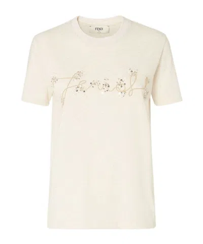 FENDI Beige Cotton And Linen T-shirt With Logo In Neutral