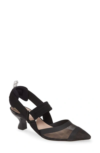 A logo-printed mesh vamp and sporty stretch straps make an unexpected pairing for a pointy-toe pump set on a beautifully sculpted heel. A cushioned heel pad with pull loop adds another utility-chic element. Style Name: Fendi Colibri Mesh Slingback Pointed Toe Pump (Women). Style Number: 5952453. Available in stores.