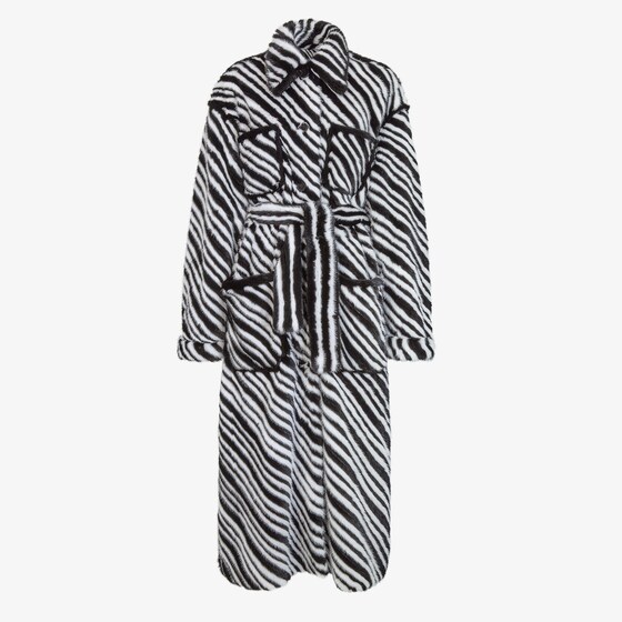 Robe-style coat with collar and dropped shoulder. Four patch pockets on the front. Fastened with invisible buttons and matching belt. Lined in printed satin. Made of mink on a chiffon base with striped motif in black and white. The special Featherlike technique makes the garment extremely light to wear. Made in Italy. Size 40