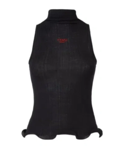 Product details drop up--btn Sleeveless top with a fitted silhouette and high neck Made of black cotton jersey with ribbed detailing Finished with ruffles at the hem and Fendi Roma lettering embroidered on the chest in red Made in Italy Composition 100 cotton Materials Size worn null The model is null tall Model height null Size worn null Product Code FS9740AVFEF0GME Sustainability FENDI AT YOUR SERVICE drop up--btn shipping returns Shipping and Returns Complimentary shipping on all orders Free returns within 14 days online or in store Free exchange in store calendar Book An Appointment Get in touch for an in-store or virtual appointment store In-store Pickup The best of both worlds shop online and pick up your order at your convenience in selected Fendi stores gift Gifting Your order will be elegantly wrapped in our signature Fendi package Add a personal message to send an exclusive gift