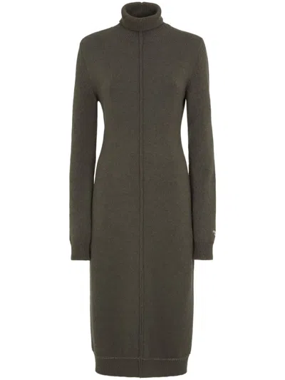 High-necked mid-length dress, low-sleeve long sleeves, ribbed edges, dark green cashmere knitted fabric, decorated with inner and outer lapel details, raised stitching and an embroidered left-arm logo.