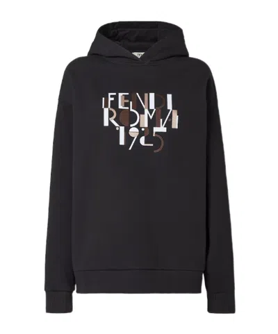 Oversize sweatshirt with hood and long low cut set-in sleeves. Ribbed cuffs and edge. Made of black cotton jersey. Customised with the Fendi Roma 1925 print and brown embroidered details, inspired by the geometric aesthetic of the 1920s and the graphic patterns of the Fendi fashion show in 2000. Made in Italy. Size S