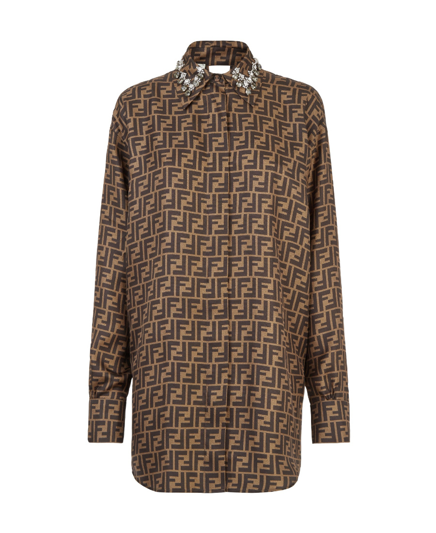 Long-sleeved design, with shoulder and cuff, back pleated and decorated with hollowed-out details, button opening and closing, twill material, brown full FF pattern printing, neckline edge decorated with artificial crystal embroidery of different shapes and sizes.